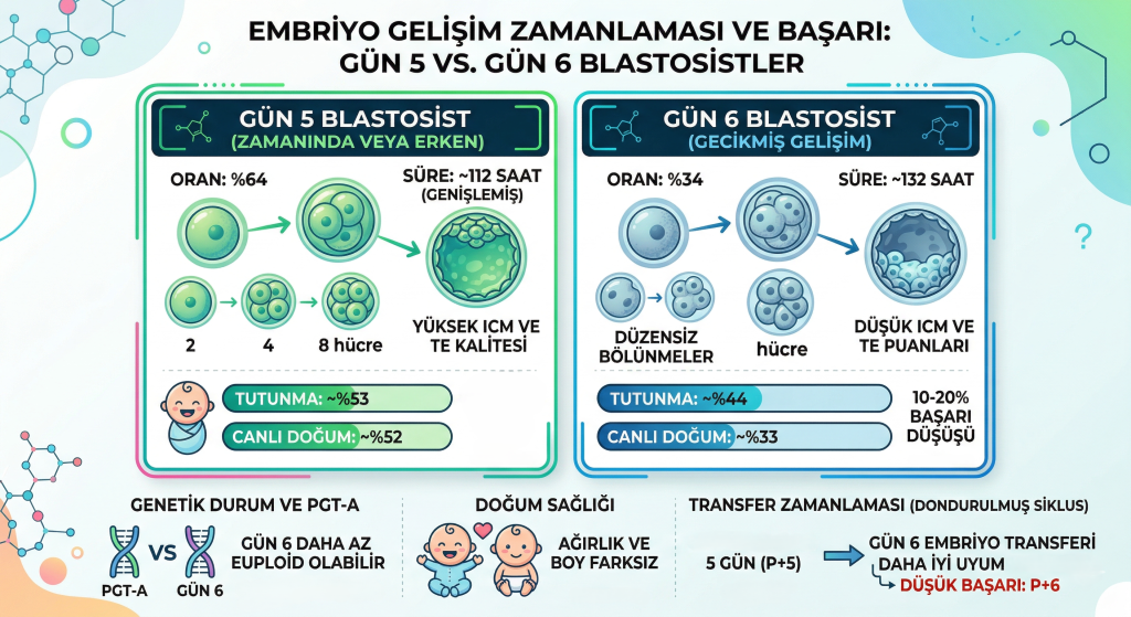 Her insan gibi embriyolar da farklıdır ve her zaman ayni hızda bölünmezler. Büyük bir kısmı 5. gün blastosist aşamasında ulaşırken küçük bir kısmı da 6. gün ve çok nadir de olsa bazı embriyolar 4. ve 7. gün blastosist aşamasına ulaşıyorlar. Blastosislerin yaklaşık 64%’i 5. gün bu asamaya ulaşırken, 34 %’ü 6. gün oluşmaktadır. Beklendiği üzere embriyonun blastosist aşamasına 6. günde ulaşması, hücre bölünme hızının ve hücrelerin organize olma zamanlamasının 5. günde ulaşan embriyolara göre gecikmiş olması demektir. 5. gün embriyoları ortalama 112 saat içinde genişlemiş blastosist olurken, 6. gün embriyoları yaklaşık 132 saat içinde bu aşamaya erişir. Bu ekstra gecikme sırasında iç hücre kitlesi ve trofektoderm puanlarında da düşüş görülür (PMID: 37381073).
