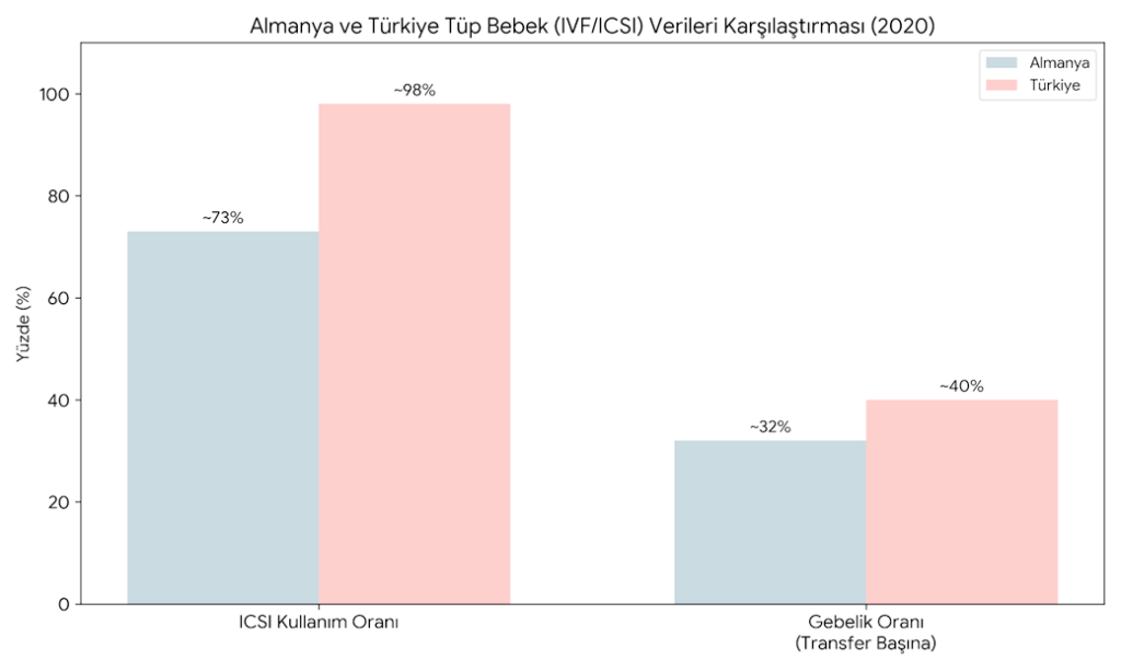 Türkiye’de mikroenjeksiyon (ICSI) kullanımının (%98) Almanya’ya (%73) kıyasla çok daha yaygın ve transfer başına gebelik oranlarında da Türkiye’nin (%40), Almanya’dan (%32) daha yüksek bir seviyede olduğu görülmektedir
