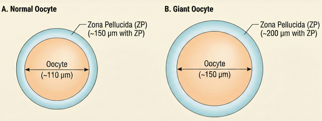 Boyutsal olarak ele alındığında, büyük oositler ZP zarı olmadan en az 130 µm çapa, ZP dahil edildiğinde ise 180 µm ve üzeri bir çapa ulaşabilen anormal gametlerdir (PMID:35559990). Bu boyutsal genişleme, hücrenin sitoplazmik hacminde kübik bir artışa neden olarak, standart bir oosite kıyasla yaklaşık 1,6 ila 2,0 kat daha fazla hücre içi hacim birikimiyle sonuçlanmaktadır.